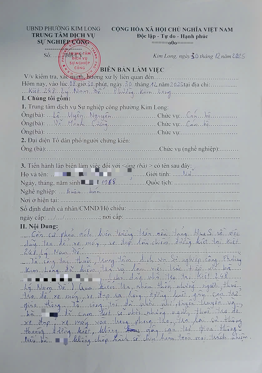 Qua kiểm tra thực tế tại kiệt 248 Lý Nam Đế, Tổ kiểm tra ghi nhận tình trạng một số xe máy, xe đạp lấn chiếm đường kiệt, gây cản trở giao thông. Tổ kiểm tra đã tiến hành lập biên bản và làm việc trực tiếp với bà T, là chủ dãy nhà trọ tại địa chỉ trên.