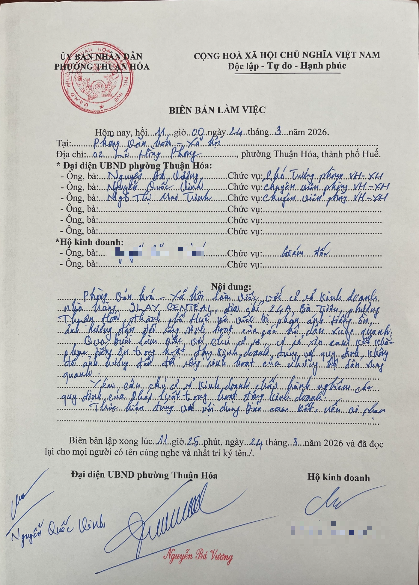 Về phía quán Slay, chủ quán đã cam kết sẽ khắc phục, đảm bảo không gây ảnh hưởng đến các hộ dân xung quanh. UBND phường yêu cầu quán tiếp tục chấp hành đầy đủ các quy định của pháp luật trong hoạt động kinh doanh; trường hợp vi phạm, quán sẽ bị xử lý theo đúng quy định pháp luật (Có biên bản làm việc cụ thể kèm theo).
