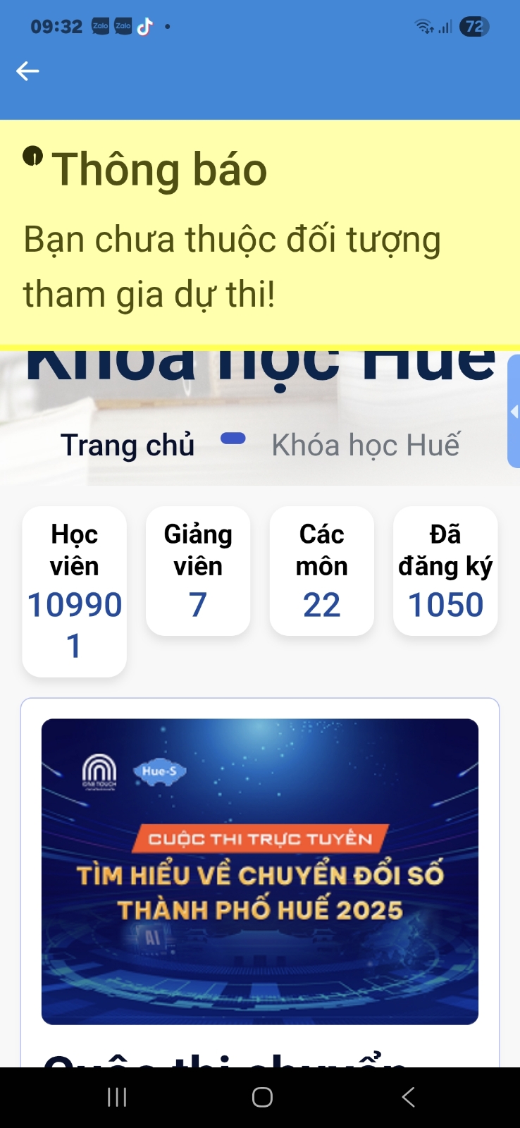Tài khoản Huế S của tôi không vào được cuộc thi trực tuyến Tìm hiểu chính sách pháp luật về lĩnh vực CTXH trên địa bàn TP Huế năm 2025 và tôi là giáo viên nhưng thi cuộc thi Cải cách hành chính của người dân từ tuần thứ 3. Kính đề nghị hỗ trợ kịp thời để thi theo Quy định của cấp trên.