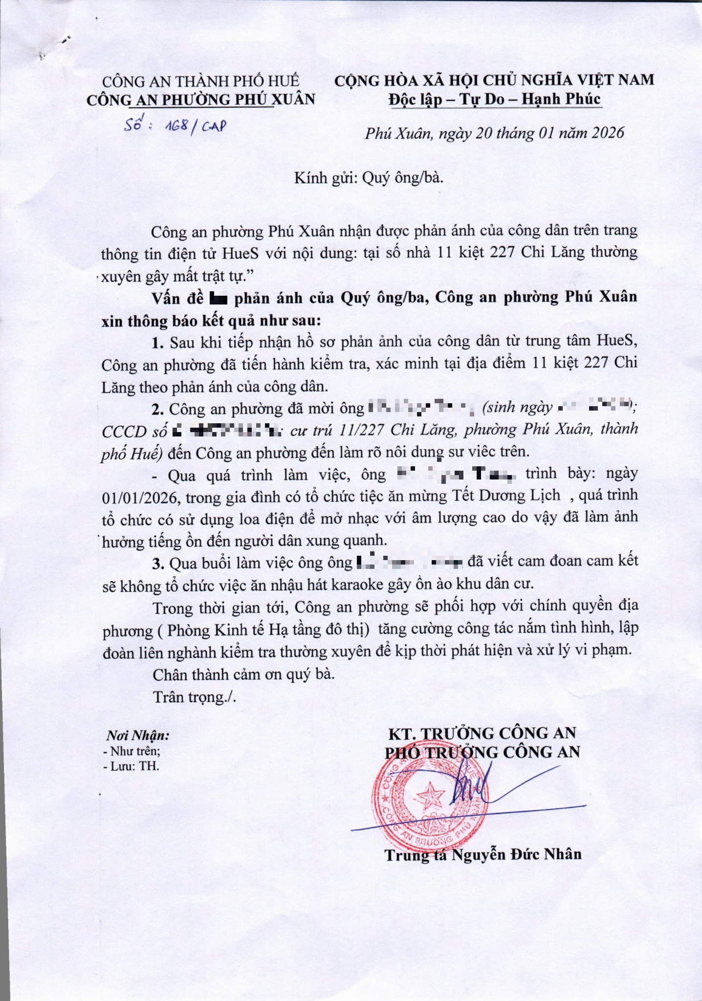 Sau khi tiếp nhận phản ánh, Công an phường đã mời ông H.N.T, cư trú 11/227 Chi Lăng làm rõ nội dung sự việc theo như phản ánh. Qua buổi làm việc, Ông H.N.T đã cam đoan cam kết sẽ không tổ chức việc ăn nhậu hát karaoke gây ồn ào khu dân cư (Đính kèm Văn bản của Công an phường, Bản cam kết)