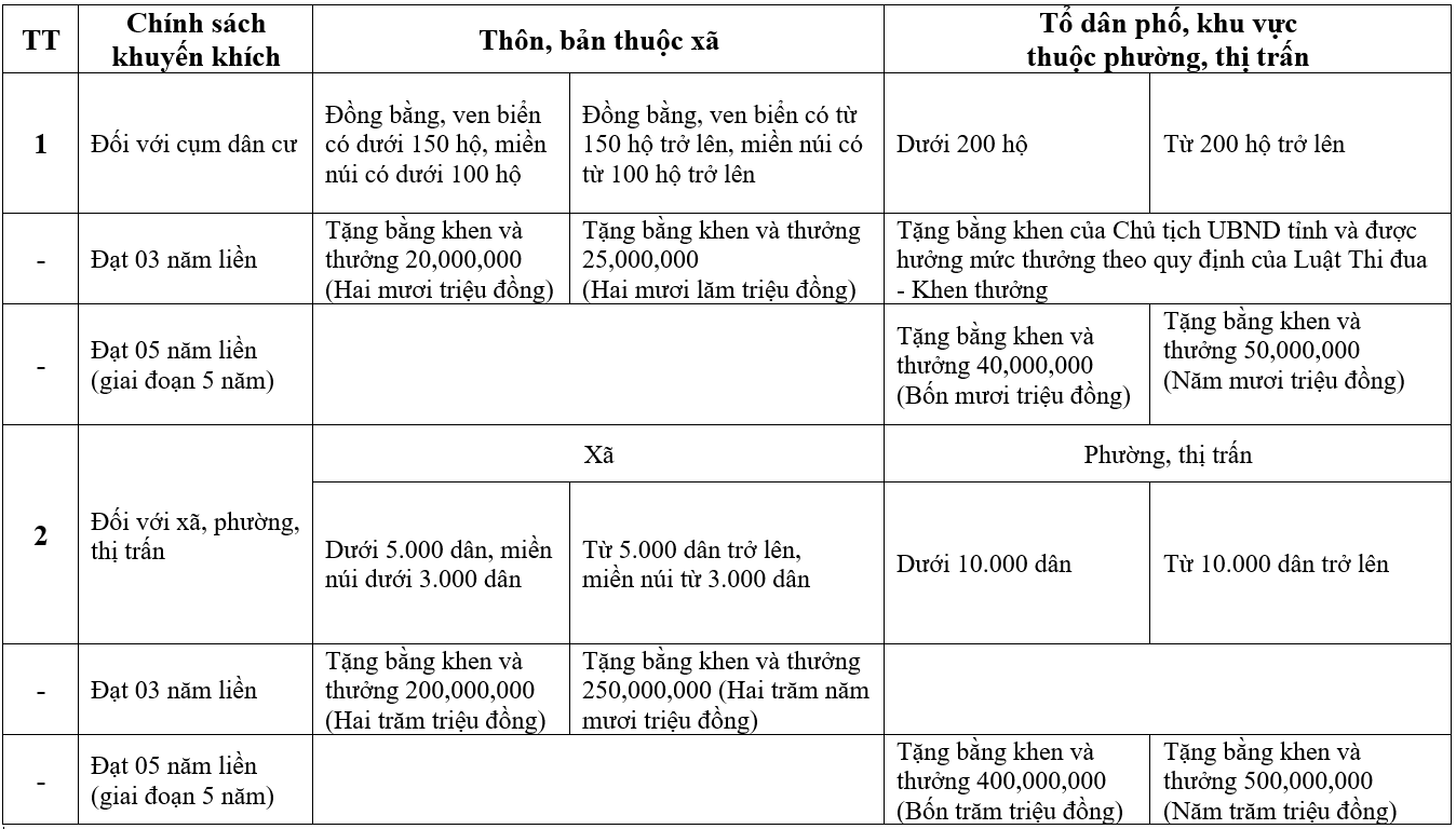 b) Thôn, bản, tổ dân phố (gọi tắt là cụm dân cư) và xã, phường, thị trấn thực hiện đạt tiêu chí mô hình “xã, phường, thị trấn, cụm dân cư không có người sinh con thứ ba trở lên” được Chủ tịch Ủy ban nhân dân các cấp khen thưởng với các mức cụ thể sau: