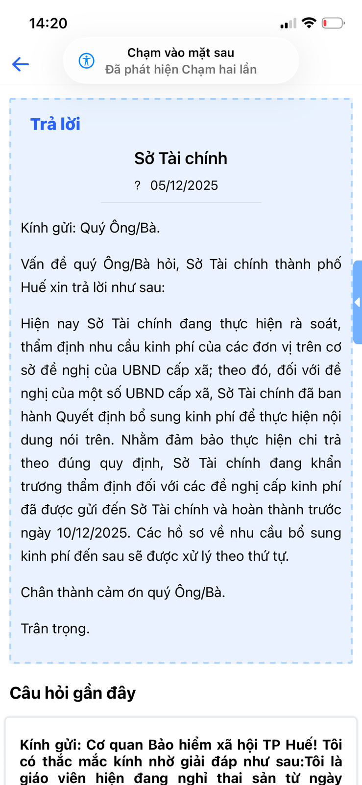Kính gửi Sở Tài Chính, tôi là Cán bộ bán chuyên trách xã Lộc An. Cho tôi hỏi tôi đã nhận được quyết định được hưởng chế độ theo NĐ 154 ngày 25/8/2025 của UBND thành phố Huế. Đến nay đã hơn 5 tháng từ ngày nghỉ việc tôi vẫn chưa được nhận chế độ, UBND xã đã lập dự toán gửi Sở Tài Chính từ tháng 10/2025. Theo thông tin Sở Tài Chính đang rà soát để cấp kinh phí trước ngày 10/12/2025 nhưng hiện nay Cán bộ BCT xã Lộc An vẫn chưa nhận được quyết định. Đề nghị cấp trên quan tâm chỉ đạo trong công tác chỉ trả chế độ vì thời gian đã kéo dài quá lâu. Và khi nào chúng tôi sẽ nhận được kinh phí hỗ trợ để anh em BCT được ổn định cuộc sống cũng như công việc mới. Trân trọng!