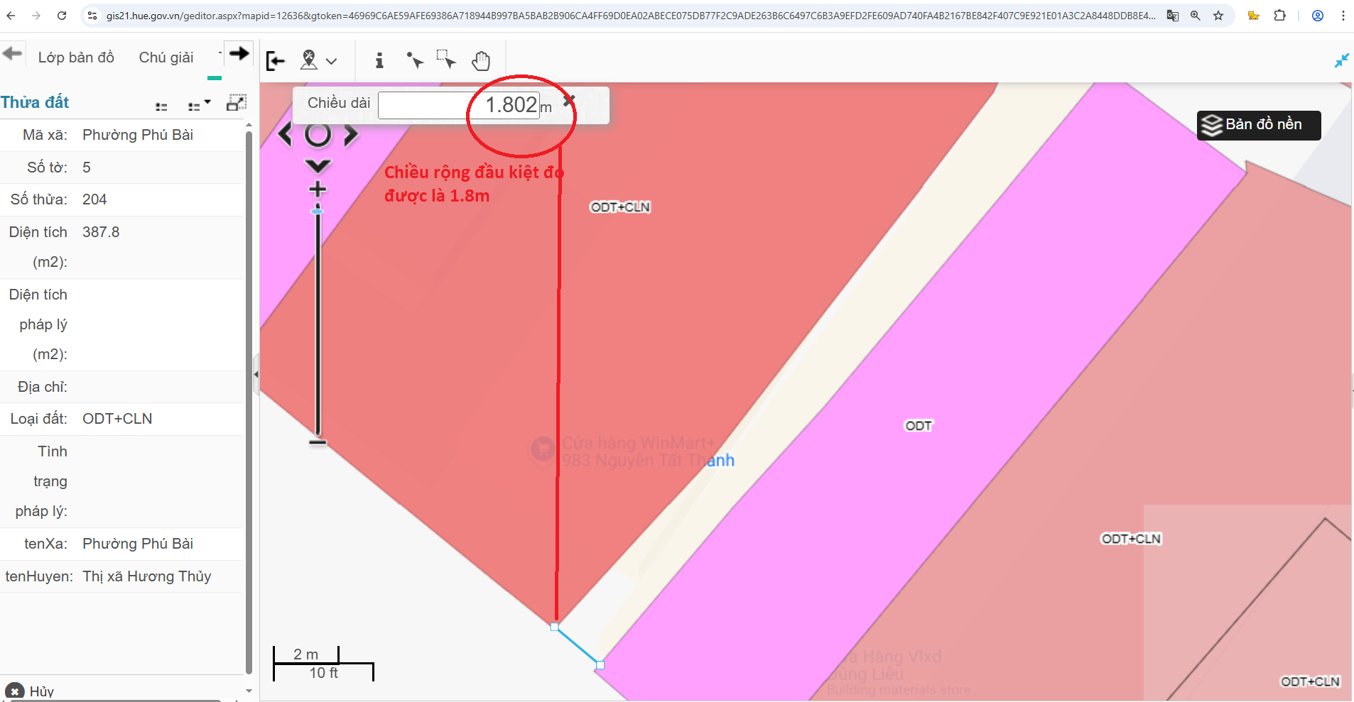 Tại đầu kiệt, bản đồ GIS thể hiện bề rộng khoảng 1,8 m — thực tế đo tại chỗ cũng ghi nhận tương đương, hai số liệu tương đối khớp nhau. (Hình ảnh GIS: be_rong_dau_kiet983_do_tren_gis.png — Hình ảnh thực địa: be_rong_diem_dau_kiet.png)