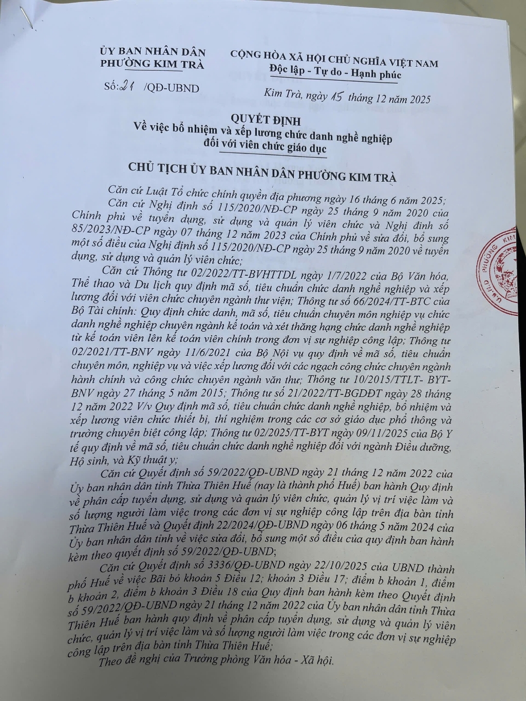 Kính gửi Sở Giáo dục và Đào tạo thành phố Huế. Tôi là một nhân viên trường học. Ngày 06/06/2024 có công văn số 590/PGDĐT Thị xã Hương Trà về việc lập hồ sơ đề nghị bổ nhiệm xếp lương theo chức danh nghề nghiệp và lập danh sách nâng lương ngạch, xét thăng hạng chức danh nghề nghiệp đối với đội ngũ nhân viên trường học. Căn cứ vào công văn số 590 nhà trường đã lập danh sách cho tôi để chuyển mã ngạch theo quy định, đến tháng 06/2025 vẫn chưa có quyết định, tôi có trực tiếp lên hỏi PGDĐT Thị Xã Hương Trà, đại điện phòng trả lời sẽ ra quyết định trước khi bỏ cấp huyện, nhưng đến nay chúng tôi vẫn chưa nhận được quyết định. Được biết hầu hết các xã phường đã triển khai thực hiện cho nhân viên trường học (gần đây nhất tháng 12/2025 phường Kim Trà đã ra quyết định). Tôi trực tiếp lên phòng văn hoá xã hội Phường Hương Trà để hỏi về vấn để này thì đại diện phòng văn hoá trả lời chưa có căn cứ để làm, để đảm bảo quyền lợi cho đội ngũ nhân viên trường học sau này kính trình Sở Giáo dục và Đào tạo xem xét. Tôi xin chân thành cảm ơn !