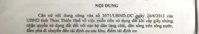Ngày 26/6/2013 UBND tỉnh Thừa Thiên Huế ban hành Công văn số 3071/UBND-ĐC ngày 26/6/2013 về việc miễn tiền sử dụng đất khi cấp Giấy chứng nhận quyền sử dụng đất đối với các hộ dân làng chài, dân sống trên sông nước, đầm phá di chuyển đến tái định cư các khu, điểm tái định cư.