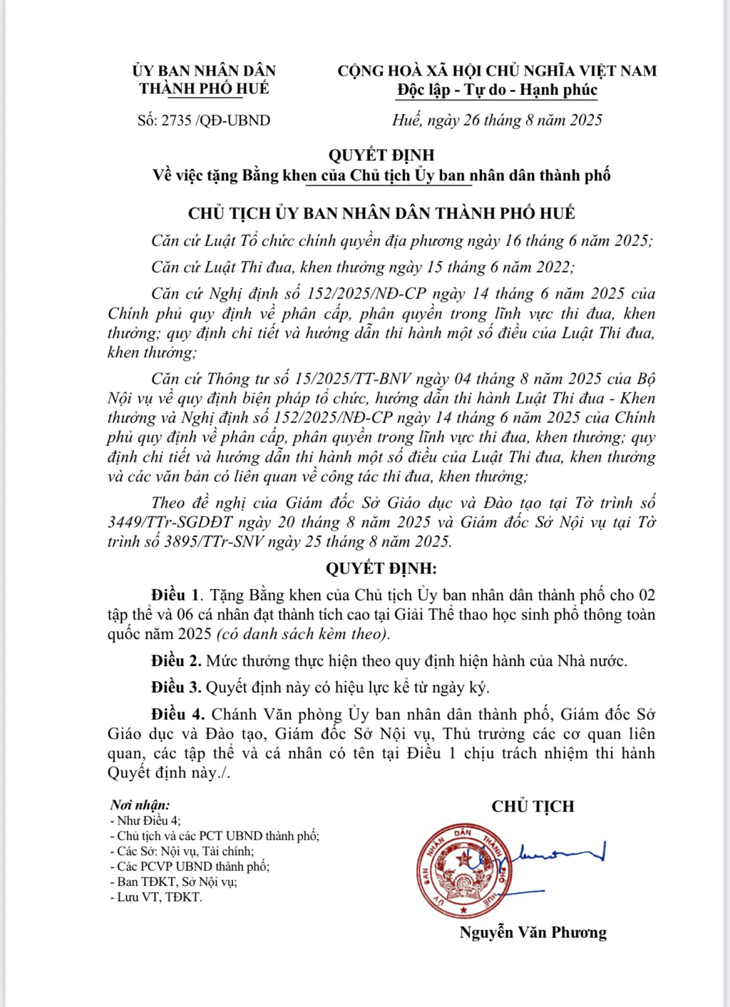 Ngày 26/8/2025, Chủ tịch UBND thành phố Huế đã ký quyết định 2735/QĐ-UBND về việc tặng Bằng khen cho học sinh các trường đạt thành tích xuất sắc trong Giải thể thao toàn quốc năm 2025. Nhưng đến nay các em vẫn chưa được nhận gì cả, vậy xin hỏi đến bao giờ các em được thực hiện như quyết định đã ký?