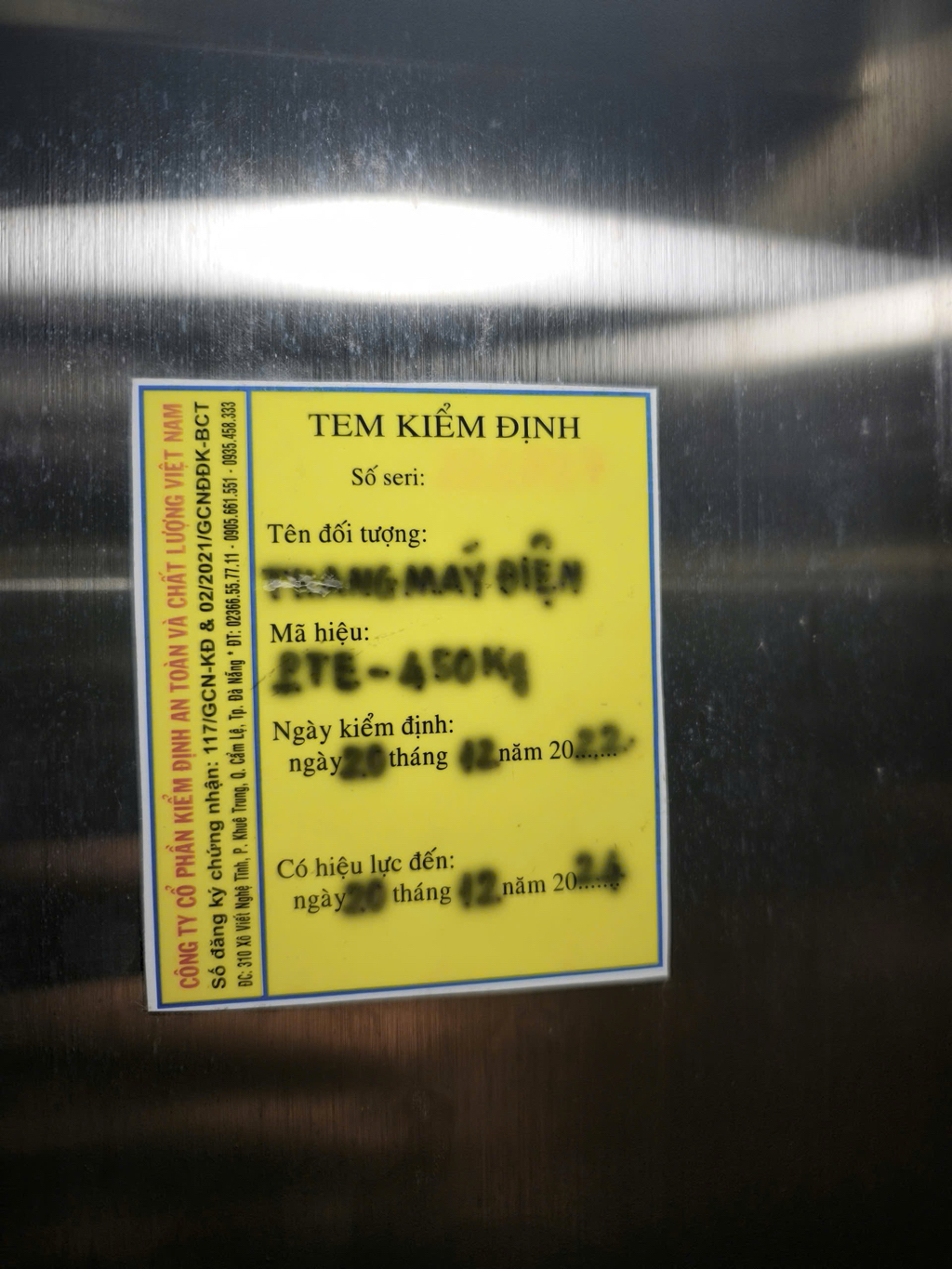 Tôi xin phản ánh về dấu hiệu vi phạm quy định an toàn đối với thiết bị thang máy tại nhà trọ địa chỉ 4/4/137 Phan Đình Phùng, phường Thuận Hóa, thành phố Huế. Tại nhà trọ này có thang máy đang được sử dụng hằng ngày cho nhiều người thuê trọ. Tuy nhiên, theo tem kiểm định dán trên thang máy thì thang máy đã hết hạn kiểm định hơn 1 năm nhưng vẫn tiếp tục đưa vào sử dụng.