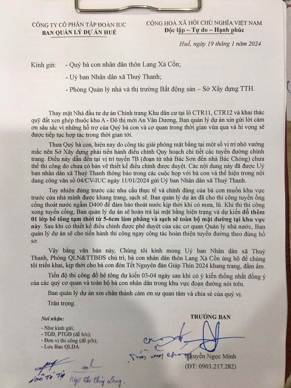 Hệ thống thoát nước và việc hoàn trả mặt bằng đường đi cho dân tại vị trí phản ánh thuộc dự án Chỉnh trang khu dân cư tại lô CTR11, CTR12 do Liên danh Công ty CP tập đoàn IUC – Công ty CP tập đoàn BGI làm Chủ đầu tư và Sở Xây dựng là đơn vị Quản lý hợp đồng thực hiện dự án. Hiện nay Chủ đầu tư đã thông tin cho Ban QLDA về việc một số vị trí bị vướng mặt bằng thực hiện dự án và Sở Xây dựng đang tiến hành điều chỉnh Quy hoạch chi tiết một số tuyến đường nội bộ hiện hữu trong khu vực triển khai dự án. Đồng thời Chủ đầu tư có cam kết khi thi công xong tuyến cống thoát nước D400 sẽ hoàn trả lại mặt bằng và dự kiến đổ thêm 01 lớp bê tông tạm thời dày 5 – 6m làm phẳng, sạch sẽ mặt đường trước Tết nguyên đán khi được toàn bộ bà con trong khu vực có đoạn đường nói trên ủng hộ, thống nhất triển khai. (Đính kèm văn bản Chủ đầu tư gửi Quý bà con thôn Lang Xá Cồn, UBND Xã Thủy Thanh, Sở xây dựng vào ngày 19/1/2024)