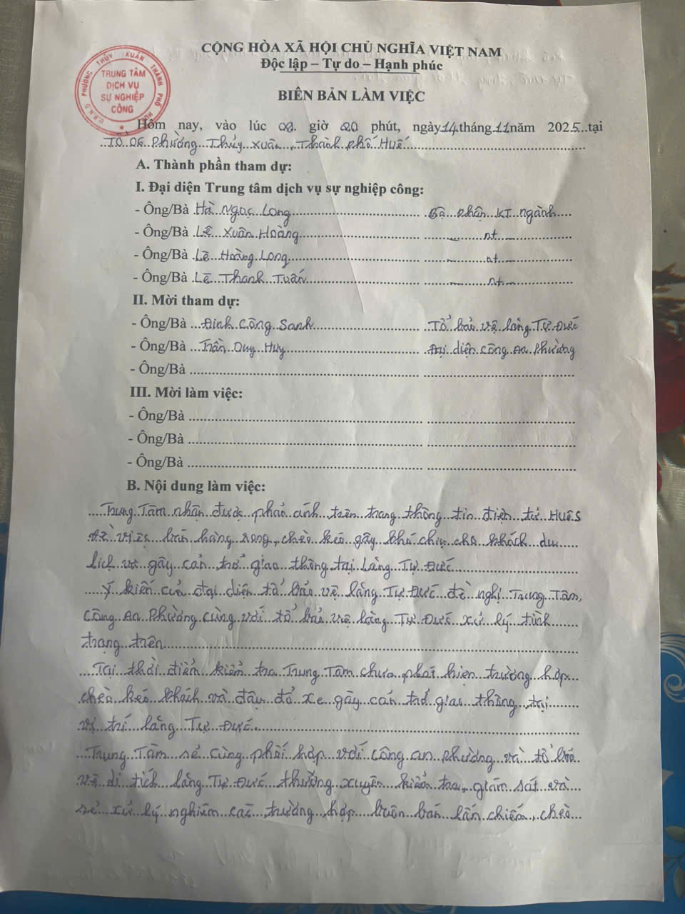 Ngày 13/11/2025, UBND phường đã chỉ đạo Trung tâm Dịch vụ sự nghiệp công phường phối hợp Công an phường, Tổ bảo vệ lăng Tự Đức để làm việc. Các trường hợp buôn bán tại điểm di tích lăng Tự Đức trước đây, UBND phường đã chỉ đạo Trung tâm Dịch vụ sự nghiệp công cho các trường hợp này ký cam kết buôn bán không được chèo kéo khách du lịch.