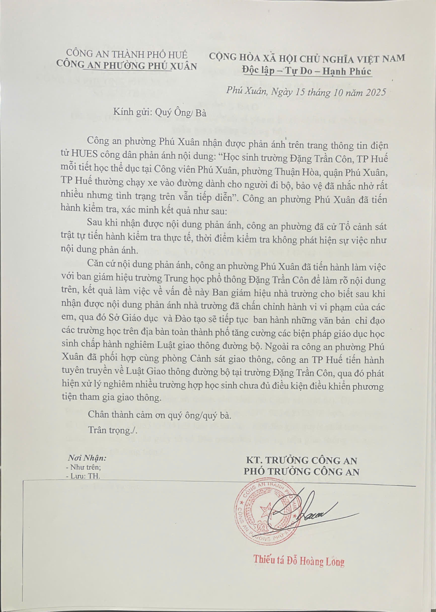 Sau khi nhận được phản ánh, Sở Giáo dục và Đào tạo đã có ý kiến chỉ đạo trực tiếp với lãnh đạo Trường THPT Đặng Trần Côn, yêu cầu nhà trường sớm chấn chỉnh hành vi vi phạm của các em học sinh.