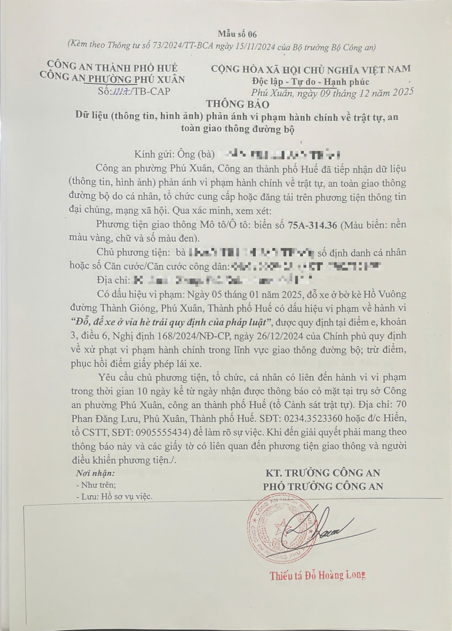 Công an phường Phú Xuân đã lập hồ sơ, thông báo chủ phương tiện đến làm việc. Tuy nhiên hiện chủ phương tiện vẫn chưa trình diện tại cơ quan. Công an phường sẽ gửi thông báo cho cơ quan đăng kiểm để đưa phương tiện vào cảnh báo trên Chương trình Quản lý kiểm định.