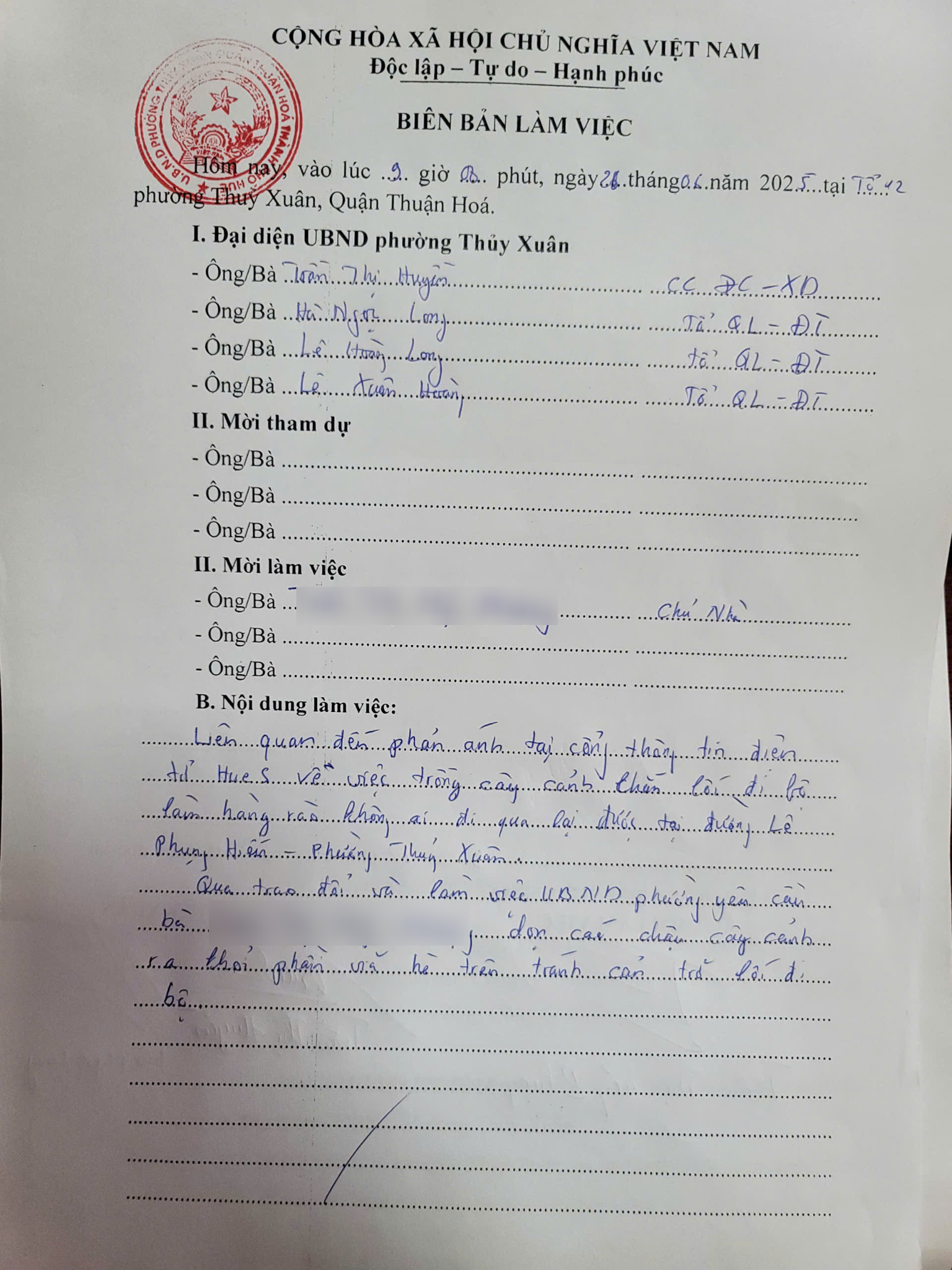 Vấn đề quý Ông/Bà phản ánh, UBND phường Thủy Xuân xin thông báo kết quả như sau: