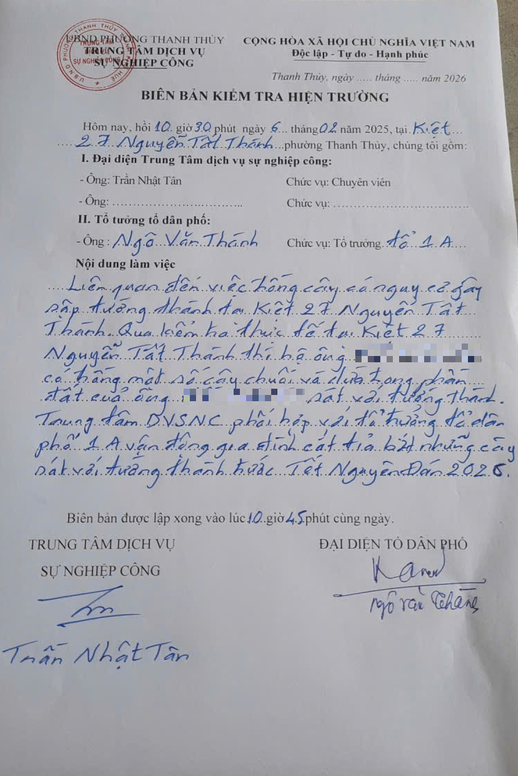 Sau khi nhận phản ánh, UBND phường đã chỉ đạo Trung tâm Dịch vụ sự nghiệp công giải quyết. Qua kiểm tra hiện trường, Trung tâm Dịch vụ sự nghiệp công đã tiến hành phối hợp với Tổ trưởng tổ dân phố 1A vận động hộ gia đình cắt tỉa bớt những cây sát với tường thành trước Tết Nguyên đán Bính Ngọ 2026.