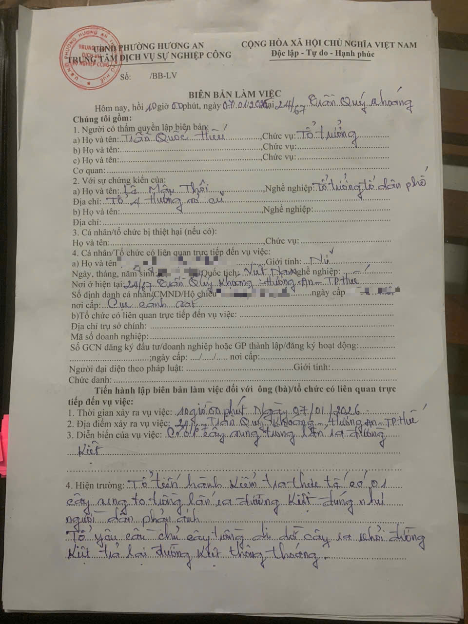 Sau khi nhận được phản ánh, Trung tâm Dịch vụ sự nghiệp công đã phân công cán bộ phối hợp với Tổ dân phố tổ 4, phường Hương An tổ chức kiểm tra thực tế tại khu vực nêu trên. Tại buổi làm việc, Trung tâm đã lập biên bản làm việc đối với bà N.T.T, địa chỉ số 24, kiệt 67 Trần Quý Khoáng, về hành vi lấn chiếm lối đi chung; cụ thể là trồng cây cổ thụ lấn chiếm đường xóm, gây ảnh hưởng đến lối đi chung của người dân.