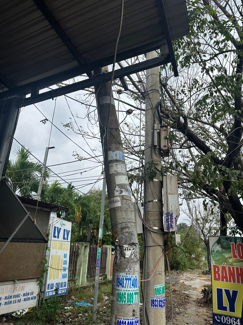 Trụ điện do ảnh hưởng của bão gần như đổ mà không có người xử lý, rất nguy hiểm tại 439 Lạc Long Quân, xã Chân Mây - Lăng Cô, TP Huế. Kính mong cơ quan chức năng xử lý.