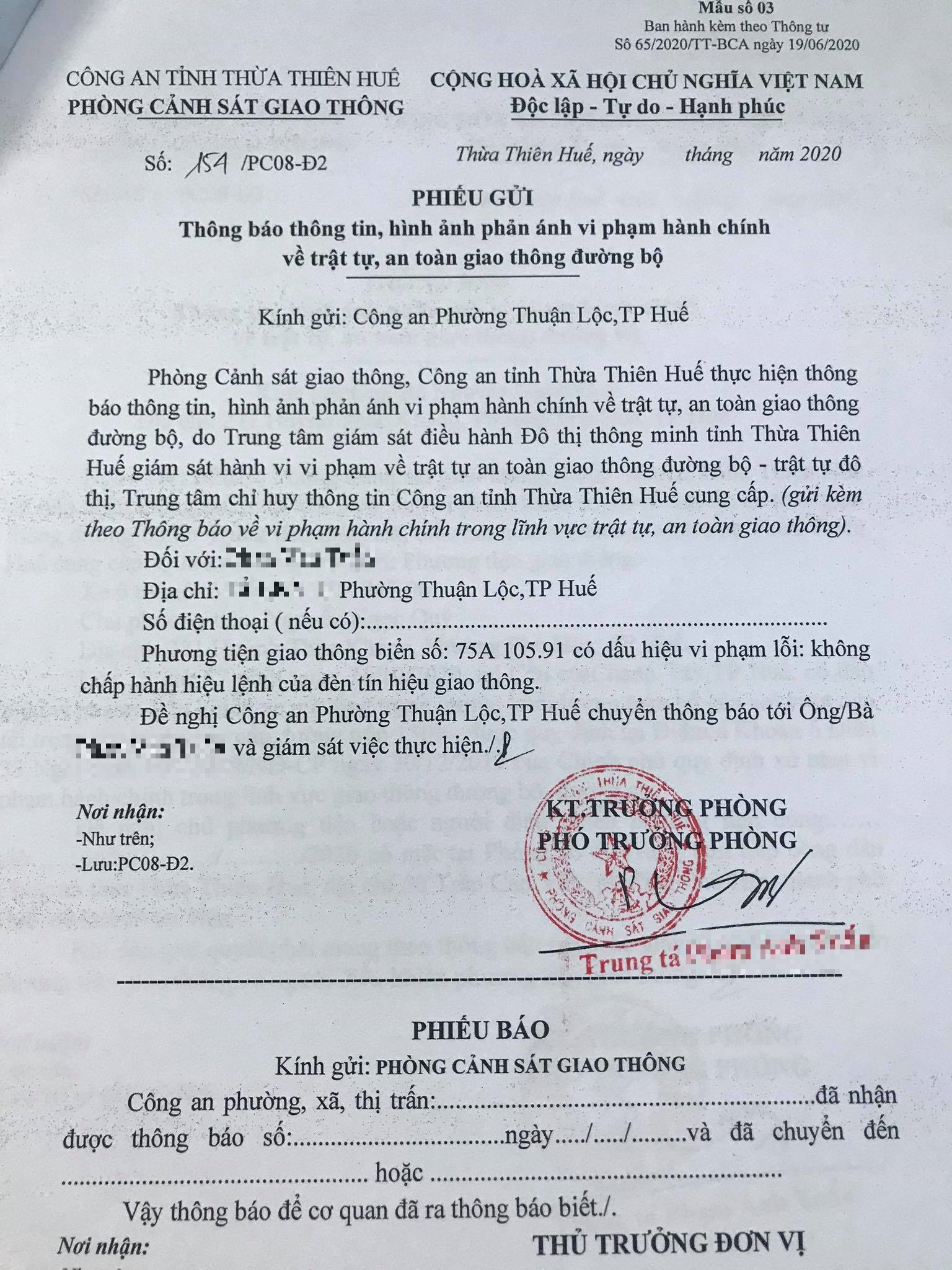 Công an tỉnh đã chỉ đạo Phòng Cảnh sát giao thông xác minh, cụ thể: Qua xác minh hình ảnh phản ánh, phương tiện 75A-105.91 vi phạm lỗi: Không chấp hành hiệu lệnh của đèn tín hiệu giao thông (quy định tại điểm a, Khoản 5, Điều 5 Nghị định 100/2019/NĐ-CP). Phòng Cảnh sát giao thông đã lập hồ sơ, gửi thông báo đến Công an địa phương nơi chủ phương tiện thường trú, yêu cầu chủ phương tiện đến làm việc. Tuy nhiên, đã quá thời hạn nhưng chủ phương tiện vẫn chưa đến trình diện tại cơ quan. Phòng Cảnh sát giao thông sẽ gửi thông báo phương tiện trên đến cục đăng kiểm để tiến hành ngăn chặn kiểm định đối với phương tiện.