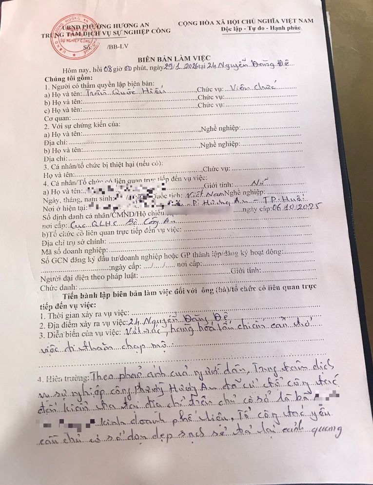 Qua nội dung phản ánh, Trung tâm dịch vụ sự nghiệp công đã phân công cán bộ tổ chức kiểm tra tại khu vực nói trên. Tại buổi làm việc ngày 29/01/2026 đã lập biên bản làm việc với cá nhân bà N.T.N, địa chỉ: 24 Nguyễn Đăng Đệ có hành vi đặt để phế liệu tại khu vực công cộng, ảnh hưởng môi trường và cảnh quan xung quanh khu vực, tổ công tác đã yêu cầu bà N chấp hành tự di chuyển khối lượng rác phế liệu nói trên ra khỏi khu vực trong thời hạn 03 ngày kể từ ngày lập biên bản. (Đính kèm biên bản làm việc)