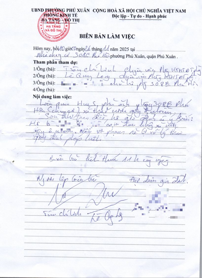 Sau khi nhận phản ánh, Phòng Kinh tế hạ tầng và Đô thị phường đã cử cán bộ về kiểm tra và lập biên bản làm việc. Qua đó, bà D.T.H chủ hộ phòng 308 E chung cư Phú Hậu đã cam đoan không xả nước gây ô nhiễm nếu còn vi phạm sẽ bị xử lý theo quy định pháp luật. (Đính kèm biên bản làm việc)
