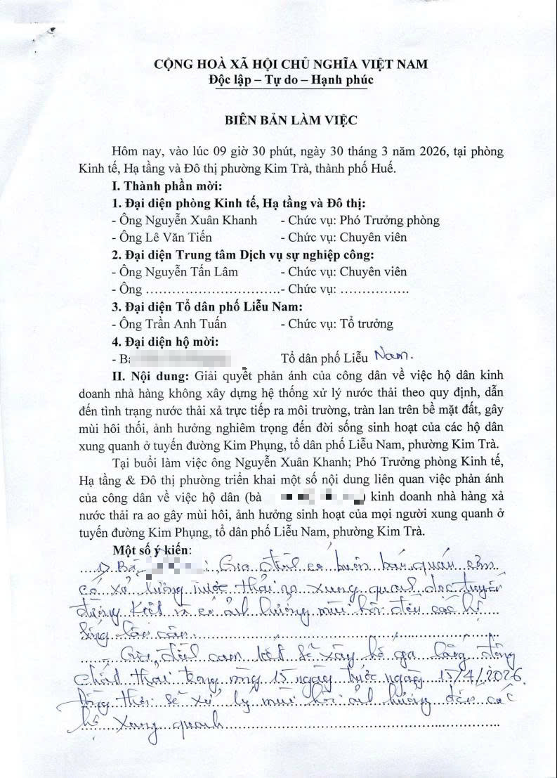 Sau khi tiếp nhận phản ánh, UBND phường đã chỉ đạo Phòng Kinh tế, Hạ tầng và Đô thị phối hợp với các đơn vị liên quan tổ chức họp liên ngành vào ngày 30/3/2026, với sự tham gia của Trung tâm Dịch vụ sự nghiệp công, Tổ trưởng Tổ dân phố Liễu Nam và hộ bà T.T.P.