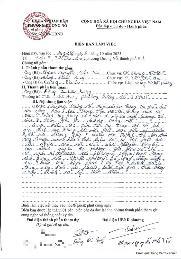 UBND phường Dương Nỗ chỉ đạo phòng Kinh tế hạ tầng và Đô thị phối hợp TDP Phò An kiểm tra thực tế tại hộ gia đình ông Đ.Q.S để ống nước xả thải của máy giặt áo quần đổ ra đường gây ô nhiễm môi trường. UBND phường nhắc nhở hộ gia đình ông Đ.Q.S khắc phục trong thời gian từ ngày 9/10/2025 đến 24/10/2025. (Đính kèm biên bản làm việc)