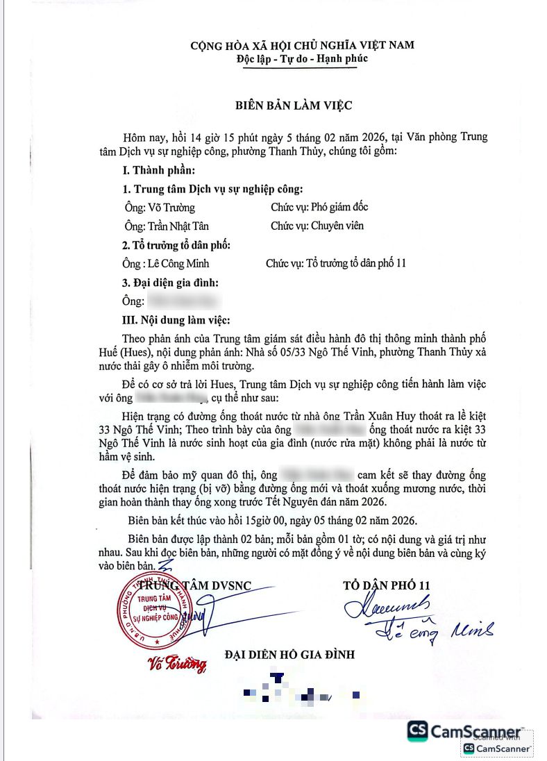 Sau khi nhận phản ánh, UBND phường đã chỉ đạo Trung tâm Dịch vụ sự nghiệp công giải quyết. Qua kiểm tra hiện trường, chủ nhà không hợp tác làm việc. Ngày 05/02/2025, Trung tâm Dịch vụ sự nghiệp công đã mời ông T.X.H, Tổ dân phố 11 họp bàn phương án giải quyết; qua buổi làm việc ông T.X.H cam kết sẽ thay thế ống nhựa mới trước Tết Nguyên đán năm 2026