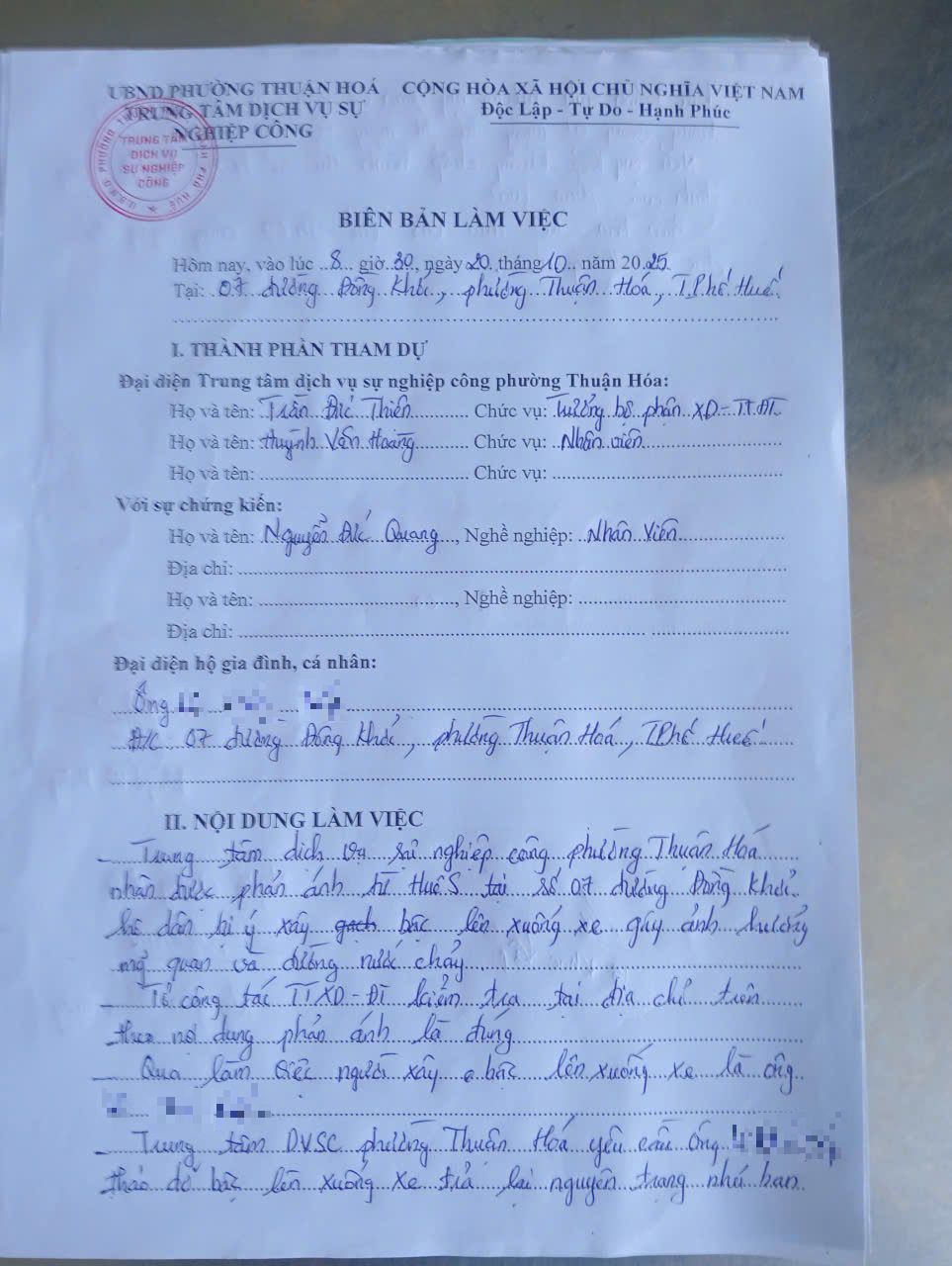 Vấn đề quý Ông/Bà phản ánh, UBND phường Thuận Hóa đã chỉ đạo Trung tâm Dịch vụ sự nghiệp công phường kiểm tra và xin thông báo kết quả như sau: