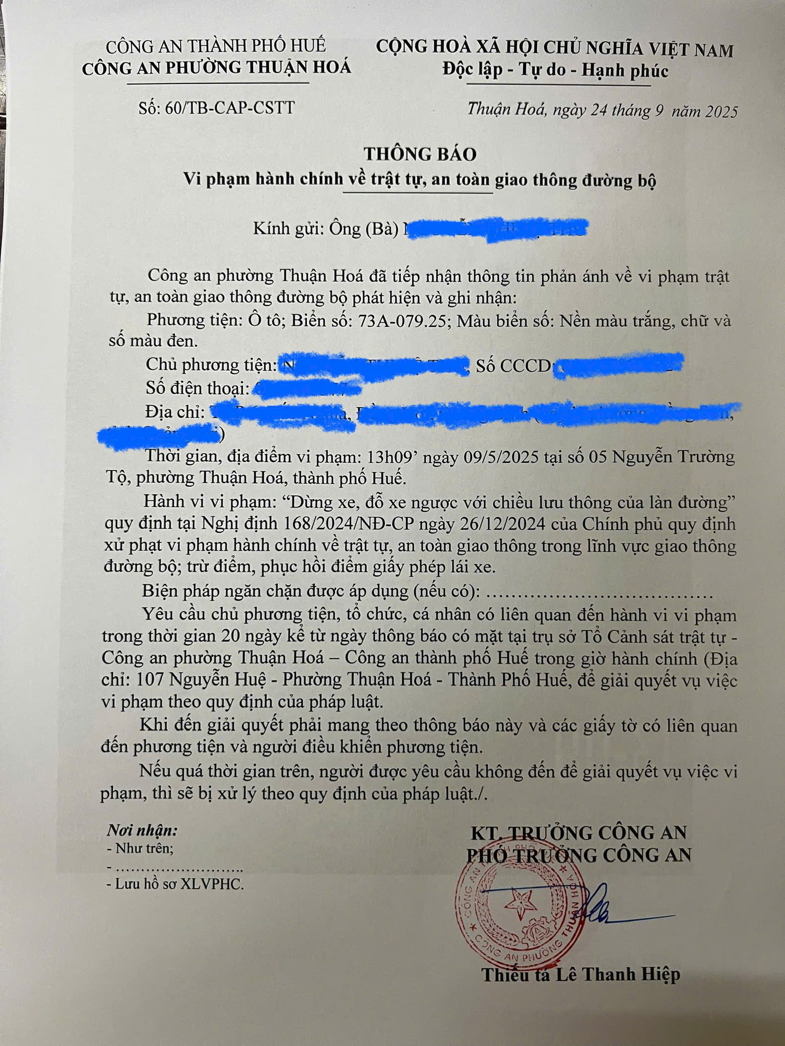Công an phường Thuận Hóa đã lập hồ sơ, thông báo chủ phương tiện đến làm việc. Nếu quá ngày hẹn mà chủ phương tiện vẫn chưa đến trình diện tại cơ quan. Công an phường Thuận Hóa sẽ gửi thông báo cho cơ quan đăng kiểm để đưa phương tiện vào cảnh báo trên Chương trình Quản lý kiểm định.