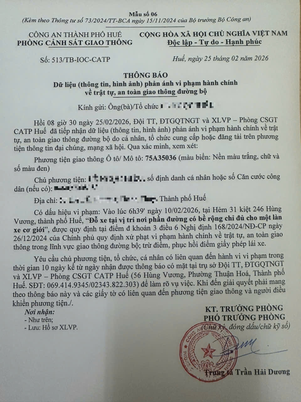 Qua hình ảnh phản ánh, người điều khiển phương tiện BKS 75A35036 có dấu hiệu vi phạm lỗi: “Đỗ xe tại vị trí nơi phần đường có bề rộng chỉ đủ cho một làn xe cơ giới”, quy định tại điểm đ, khoản 3, điều 6 Nghị định số 168/2024/NĐ-CP ngày 26/12/2024 của Chính phủ quy định xử phạt vi phạm hành chính về trật tự, an toàn giao thông trong lĩnh vực giao thông đường bộ; trừ điểm, phục hồi điểm giấy phép lái xe.