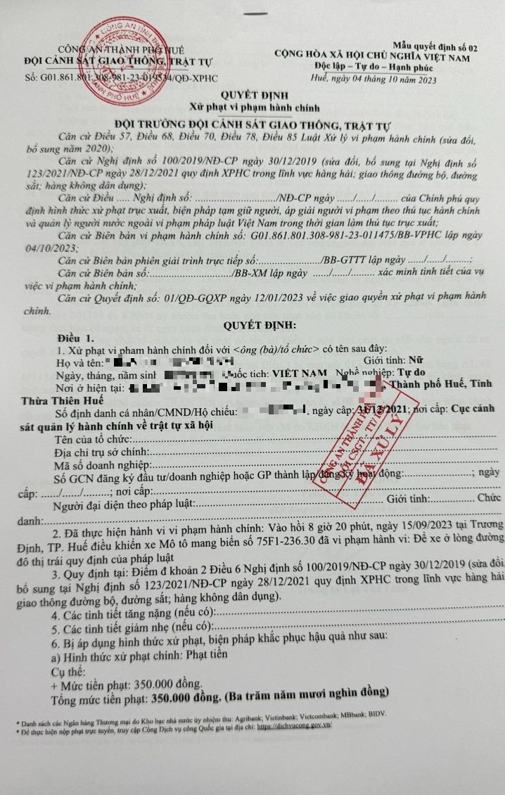 Công an thành phố đã ra Quyết định xử phạt 350.000 đồng đối với người điều khiển phương tiện.