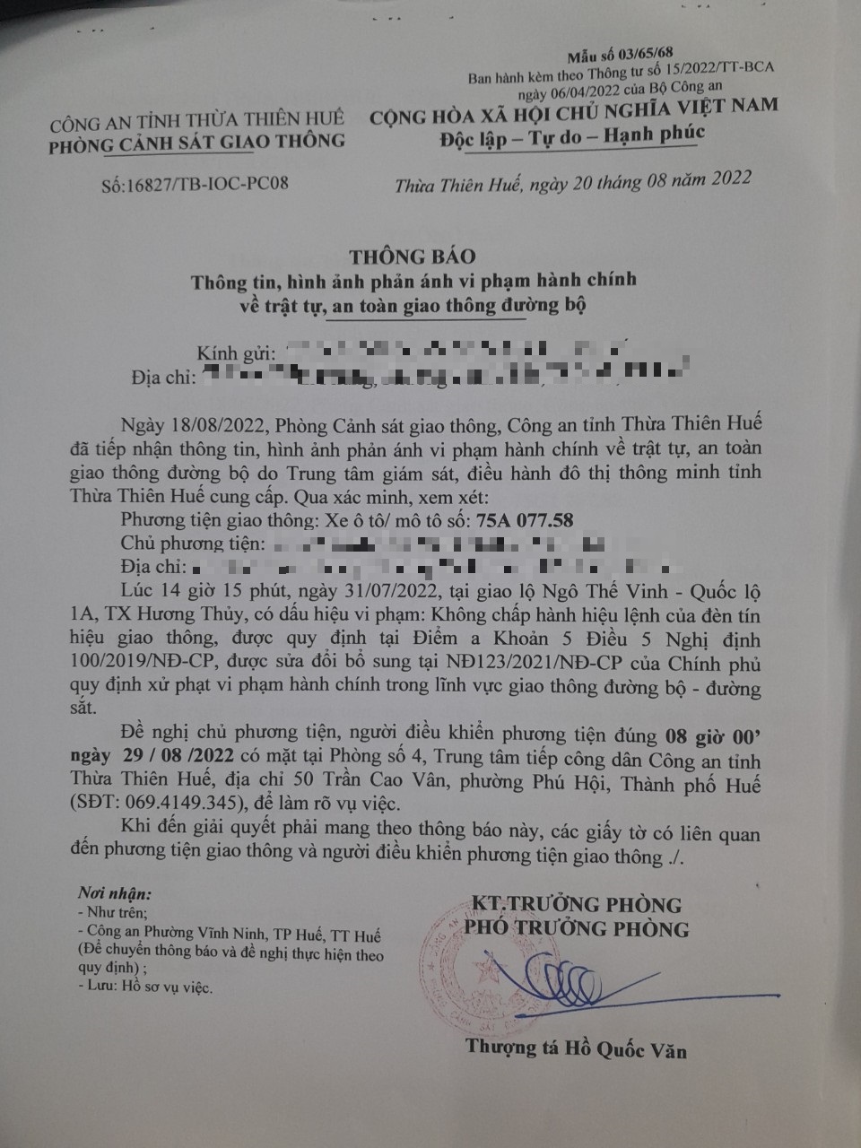 Vào lúc 14 giờ 15 phút, ngày 31/07/2022 Ô tô mang biển kiểm soát 75A07758 Không chấp hành hiệu lệnh của đèn tín hiệu giao thông tại địa điểm Ngô Thế Vinh - QL1A
