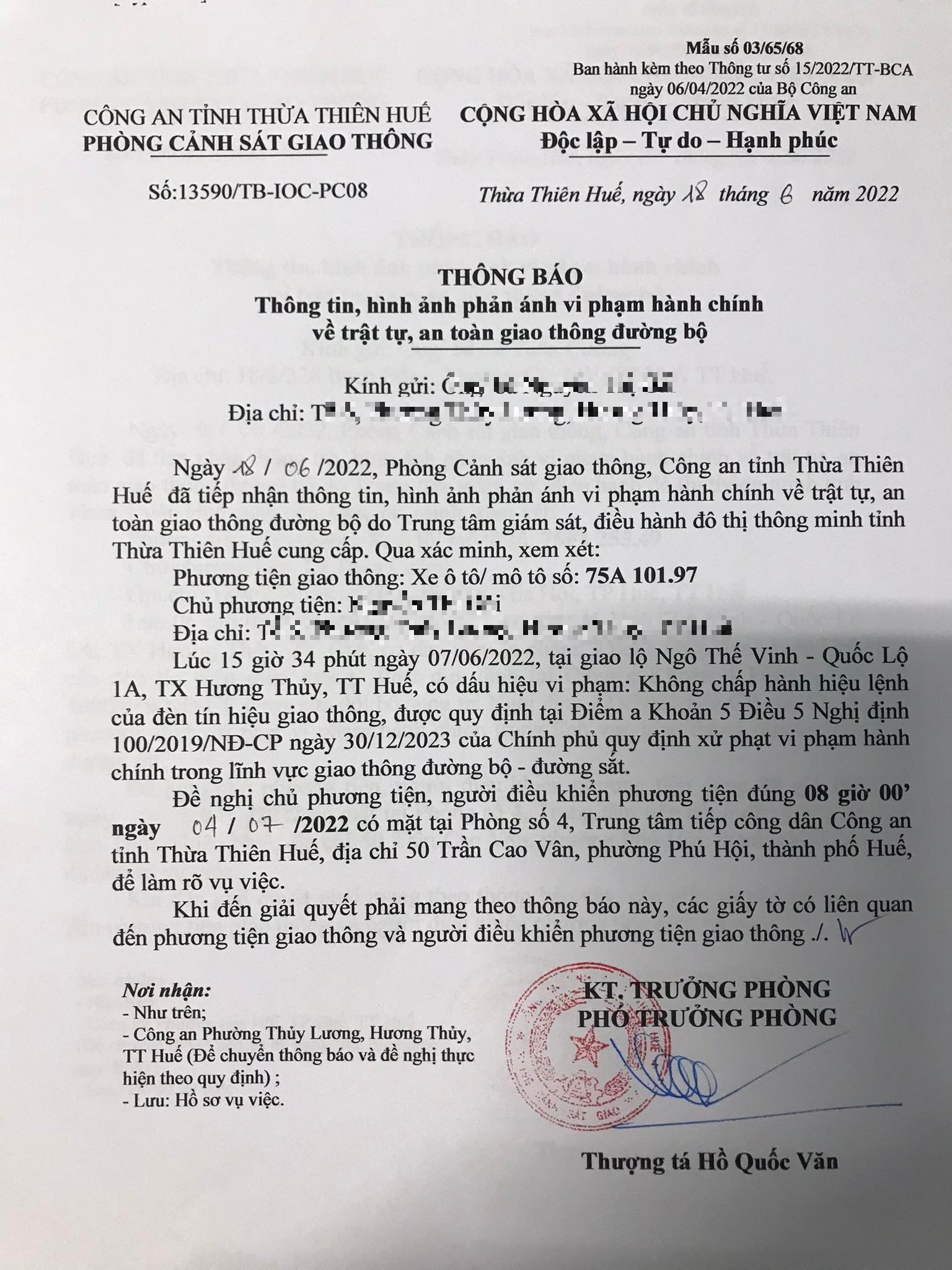 Phòng Cảnh sát giao thông xác định lỗi vi phạm của người điều khiển phương tiện 75A10197 như sau: Không chấp hành hiệu lệnh của đèn tín hiệu giao thông , quy định tại điểm a, khoản 5, điều 5 Nghị định 100/2019/NĐ-CP được sửa đổi, bổ sung tại Nghị định 123/NĐ-CP ngày 28/12/2021.