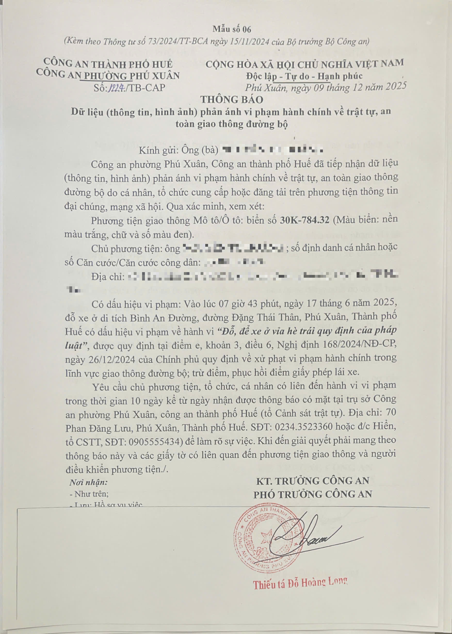 Công an phường Phú Xuân đã lập hồ sơ, thông báo chủ phương tiện đến làm việc. Tuy nhiên hiện chủ phương tiện vẫn chưa trình diện tại cơ quan. Công an phường sẽ gửi thông báo cho cơ quan đăng kiểm để đưa phương tiện vào cảnh báo trên Chương trình Quản lý kiểm định.