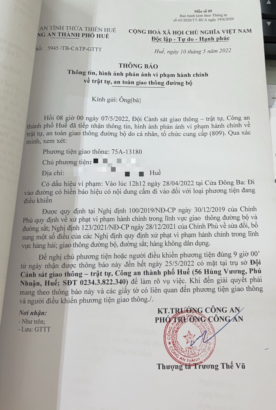 Vấn đề Ông/Bà phản ánh, Công an tỉnh đã chỉ đạo Công an thành phố Huế kiểm tra và trả lời như sau: