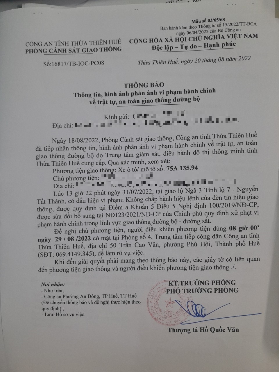 Phòng Cảnh sát giao thông xác định lỗi vi phạm của người điều khiển phương tiện: Không chấp hành hiệu lệnh của đèn tín hiệu giao thông (quy định tại điểm a, khoản 5, Điều 5 Nghị định 100/2019/NĐ-CP, sửa đổi bổ sung tại Nghị định 123/2021/NĐ-CP).