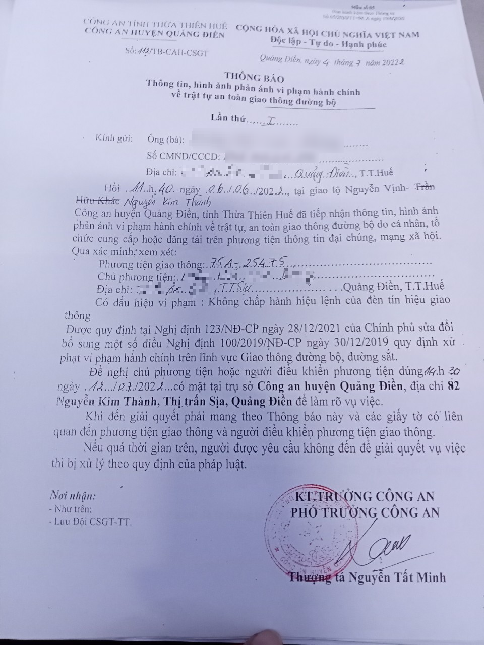 Tại cơ quan, chủ phương tiện đã xem hình ảnh, công nhận vi phạm lỗi: Không chấp hành hiệu lệnh của đèn tín hiệu giao thông (quy định tại điểm e, Khoản 4, Điều 6 Nghị định 100/2019/NĐ-CP, sửa đổi bổ sung tại Nghị định 123/2021/NĐ-CP), đồng thời cam kết không tái phạm. Công an huyện Quảng Điền đã lập biên bản vi phạm hành chính, ra quyết định xử phạt đối với chủ phương tiện về lỗi trên, phạt tiền 5.000.000đ, tước giấy phép lái xe 02 tháng.