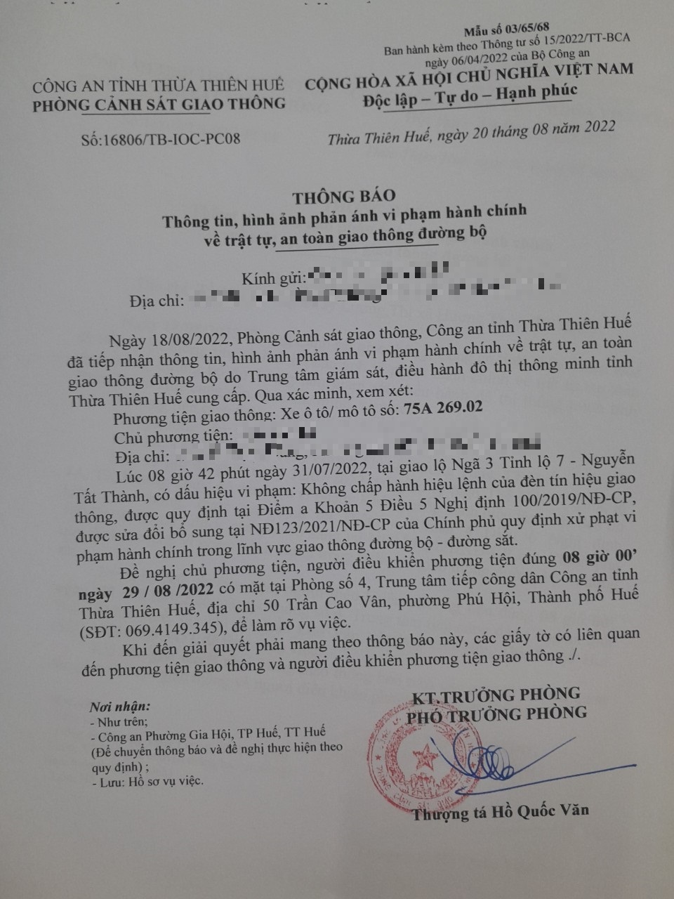 Vào lúc 08 giờ 42 phút ngày 31/07/2022, ô tô mang biển kiểm soát 75A26902 không chấp hành hiệu lệnh của đèn tín hiệu giao thông tại giao lộ Ngã 3 Tĩnh lộ 7 - Nguyễn Tất Thành.