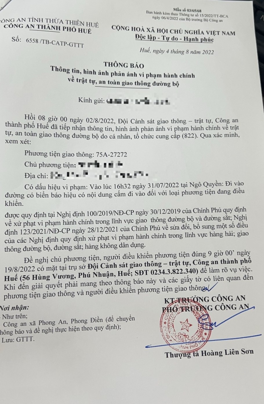 Vấn đề Ông/Bà phản ánh, Công an tỉnh đã chỉ đạo Công an thành phố Huế xin thông báo kết quả xử lý như sau: