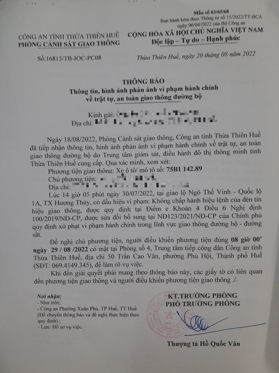 Vào lúc 14 giờ 05 phút ngày 30/07/2022, mô tô mang biển kiểm soát 75B114289 không chấp hành hiệu lệnh của đèn tín hiệu giao thông tại giao lộ Quốc Lộ 1A - Ngô Thế Vinh.