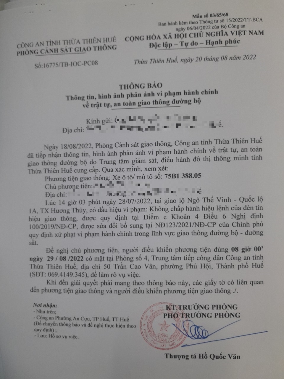 Vào lúc 14 giờ 03 phút ngày 28/07/2022, mô tô mang biển kiểm soát 75B138805 không chấp hành hiệu lệnh của đèn tín hiệu giao thông tại giao lộ Quốc Lộ 1A - Ngô Thế Vinh.