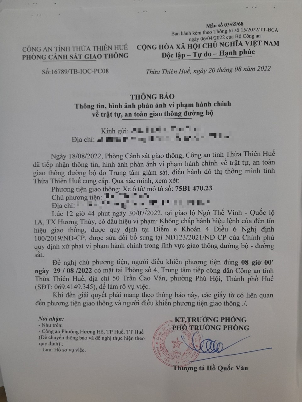Vào lúc 12 giờ 44 phút ngày 30/07/2022, mô tô mang biển kiểm soát 75B147023 không chấp hành hiệu lệnh của đèn tín hiệu giao thông tại giao lộ Quốc Lộ 1A - Ngô Thế Vinh.