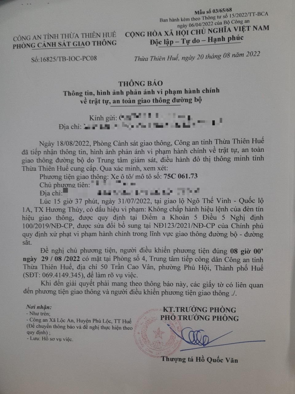 Vào lúc 15 giờ 37 phút, ngày 31/07/2022 Xe tải mang biển kiểm soát 75C06173 Không chấp hành hiệu lệnh của đèn tín hiệu giao thông tại địa điểm Ngô Thế Vinh - QL1A