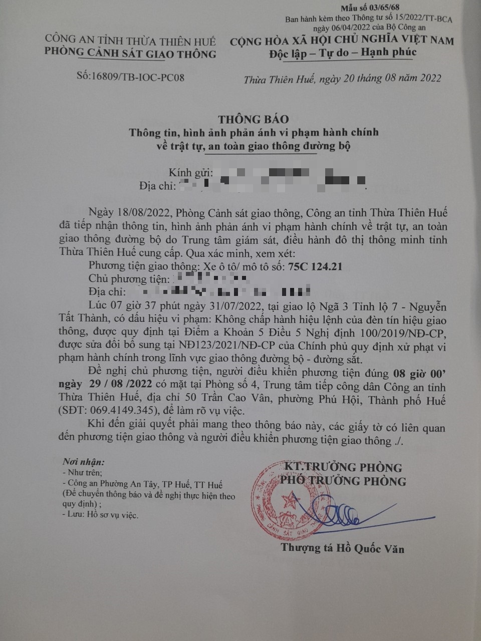 Vào lúc 07 giờ 37 phút ngày 31/07/2022, ô tô mang biển kiểm soát 75C12421 không chấp hành hiệu lệnh của đèn tín hiệu giao thông tại giao lộ Ngã 3 Tĩnh lộ 7 - Nguyễn Tất Thành.