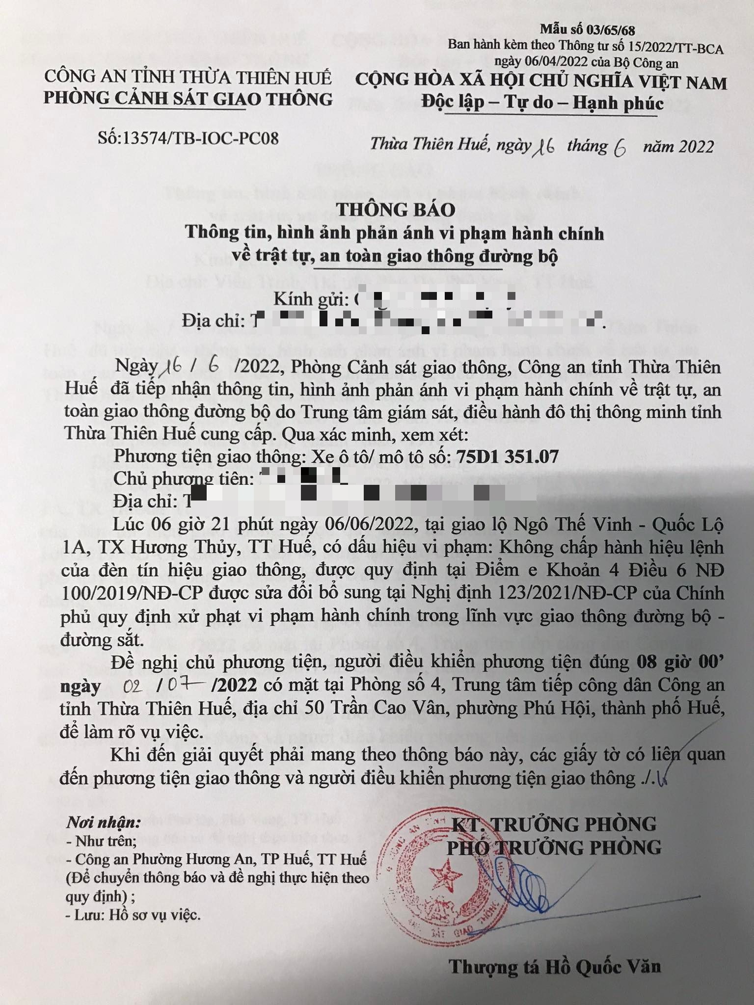 Vào lúc 06 giờ 21 phút ngày 06/06/2022, mô tô mang biển kiểm soát 75D135107 không chấp hành hiệu lệnh của đèn tín hiệu giao thông tại giao lộ Quốc Lộ 1A - Ngô Thế Vinh.