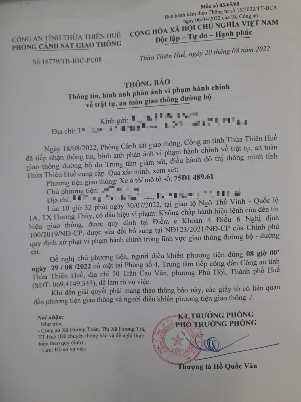 Vào lúc 10 giờ 32 phút ngày 30/07/2022, mô tô mang biển kiểm soát 75D148961 không chấp hành hiệu lệnh của đèn tín hiệu giao thông tại giao lộ Quốc Lộ 1A - Ngô Thế Vinh.