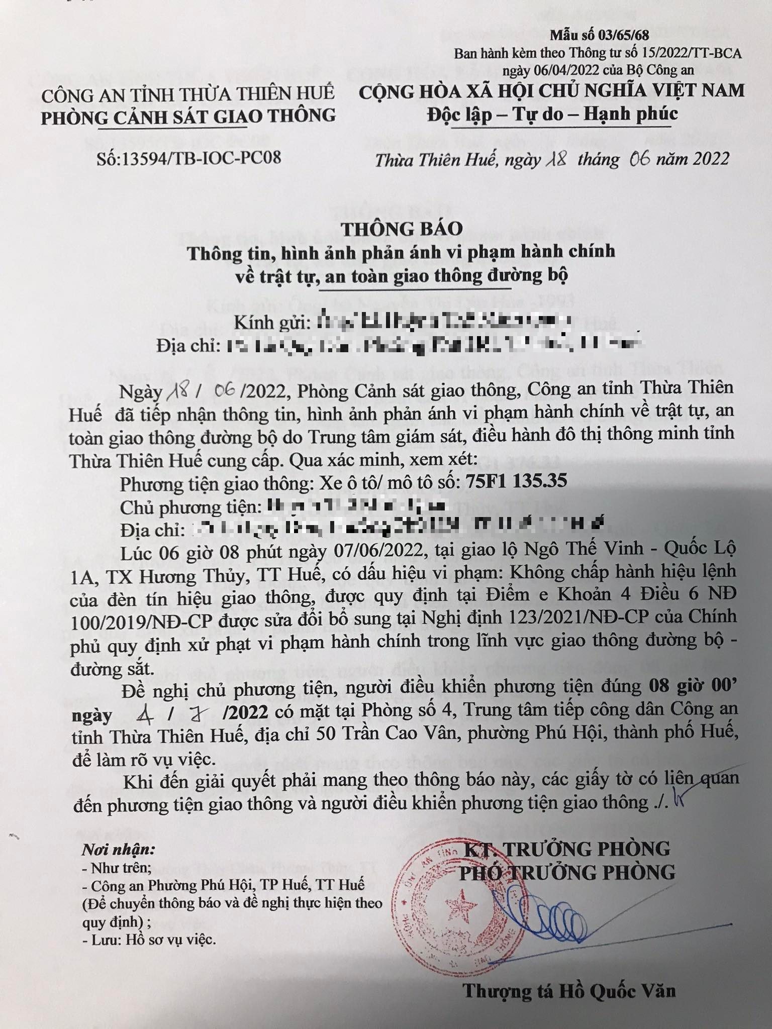 Vào lúc 06 giờ 08 phút ngày 07/06/2022, mô tô mang biển kiểm soát 75F113535 không chấp hành hiệu lệnh của đèn tín hiệu giao thông tại giao lộ Ngô Thế Vinh - QL1A.