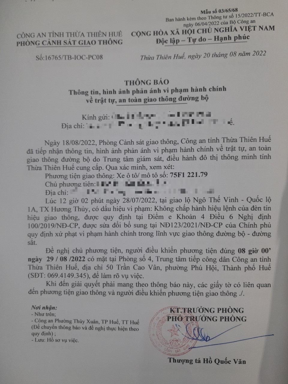Vào lúc 12 giờ 02 phút ngày 28/07/2022, mô tô mang biển kiểm soát 75F122179 không chấp hành hiệu lệnh của đèn tín hiệu giao thông tại giao lộ Quốc Lộ 1A - Ngô Thế Vinh.