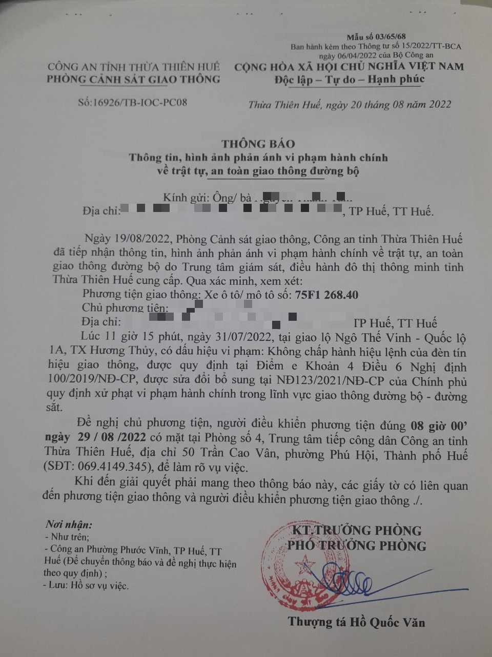 Vào lúc 11 giờ 15 phút, ngày 31/07/2022 Xe máy mang biển kiểm soát 75F126840 Không chấp hành hiệu lệnh của đèn tín hiệu giao thông tại địa điểm Ngô Thế Vinh - QL1A