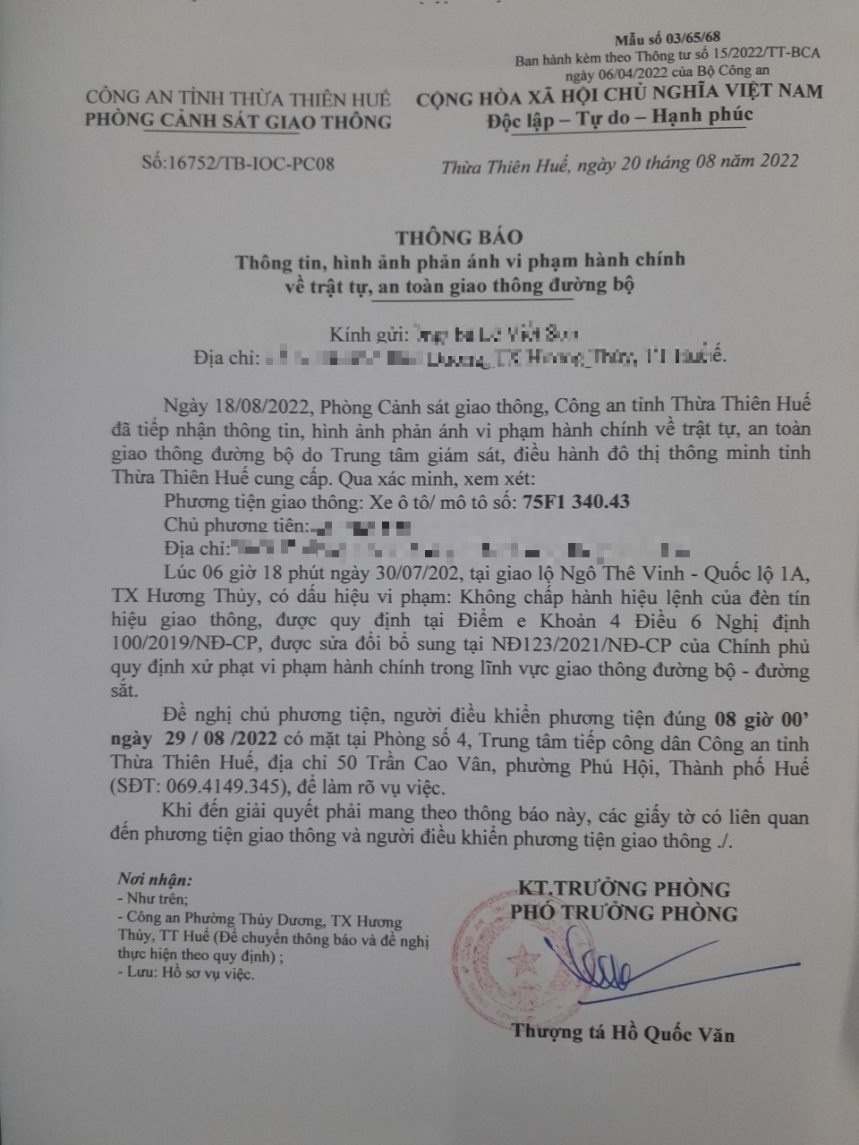 Vào lúc 06 giờ 18 phút ngày 30/07/2022, mô tô mang biển kiểm soát 75F134043 không chấp hành hiệu lệnh của đèn tín hiệu giao thông tại giao lộ Quốc Lộ 1A - Ngô Thế Vinh.