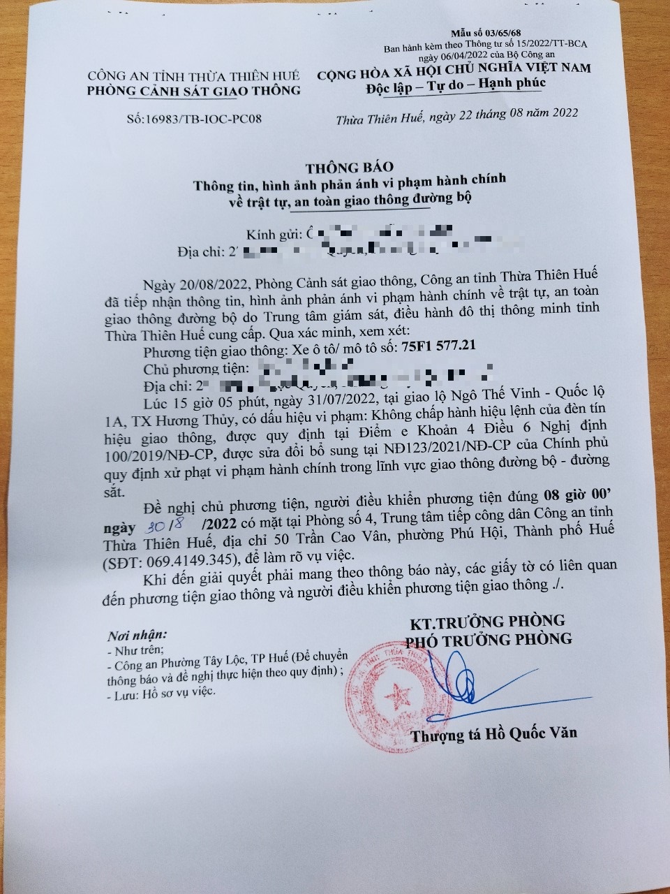 Vào lúc 15 giờ 05 phút, ngày 31/07/2022 Xe máy mang biển kiểm soát 75F157721 Không chấp hành hiệu lệnh của đèn tín hiệu giao thông tại địa điểm Ngô Thế Vinh - QL1A
