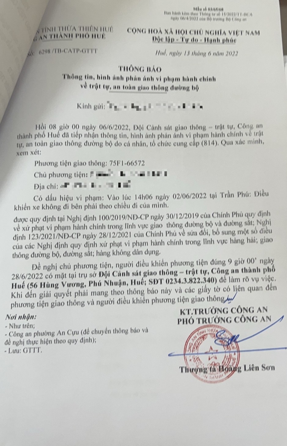 Công an thành phố đã lập hồ sơ, thông báo chủ phương tiện đến làm việc vào ngày 28/6/2022. Tuy nhiên, hiện chủ phương tiện vẫn chưa trình diện tại cơ quan. Công an thành phố Huế sẽ tiếp tục thông báo lực lượng tuần tra trên địa bàn, trong quá trình làm nhiệm vụ phát hiện, xử lý.